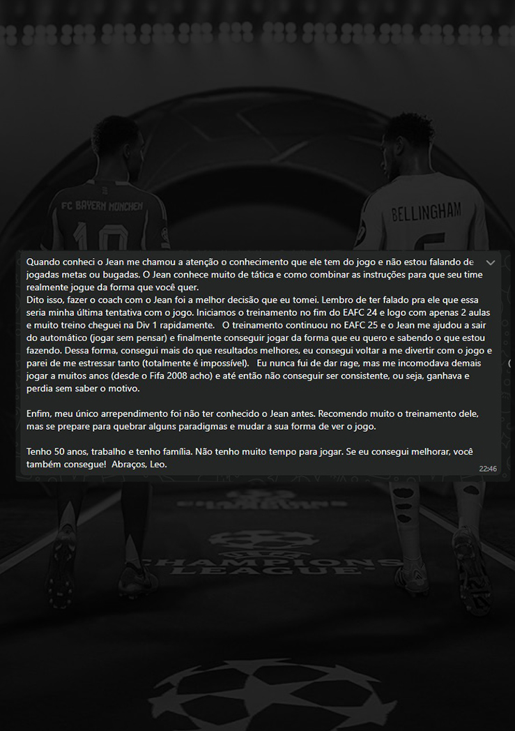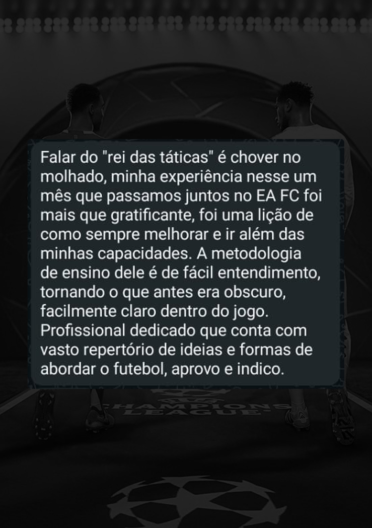 Minha missão é simples: ajudar jogadores comuns a entender o meta, aplicar táticas de verdade e alcançar resultados dentro do EAFC.